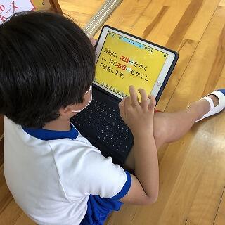 測定を待つ間に、上学年の児童は測定の受け方を自分のタブレットで確認していました。
