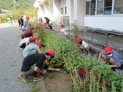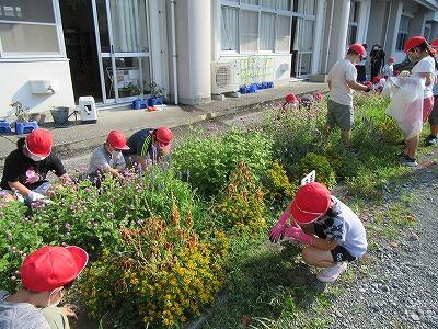 29日の朝の時間は、全校児童と職員でそれぞれの学年の花壇整備を行いました。1か月の夏休みを経て、各花壇には、雑草が生い茂っていました。それをみんなで協力して抜いていきました。子ども達は、植物の生命力には、すごいものがあるときっと驚いたことでしょう。