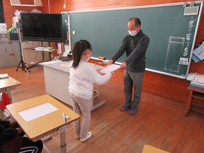 その後、教室で通知表が渡されました。通知表を受け取ると、子ども達はキラキラと目を輝かせながら、中を開いて確かめていました。