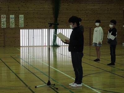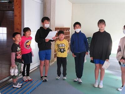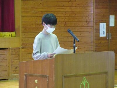 次に始業式を行いました。最初に6年生の藤井優太郎さんが意見発表を行いました。最高学年になって頑張ることについて6年生らしいしっかりとした態度で発表しました。次に校長がマスクを外しても良くなったことや今年チャレンジしてほしいこと等の話をしました。最後に全員で校歌を斉唱しました。