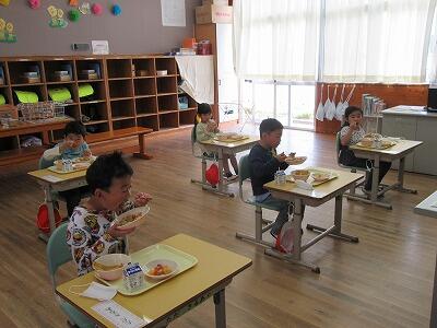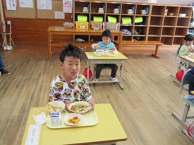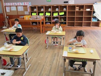 昨日、入学した新1年生5名、今日は元気に全員が登校してきました。午前中は、4時間授業を頑張り、かなりお腹もすいたようでした。そして、待ちに待った小学校での給食を体験しました。メニューは、牛乳、ポークカレー、フルーツポンチでした。みんな行儀良く、「美味しい、美味しい」と言いながら食べていました。1年生の皆さん、明日の給食も楽しみですね。
