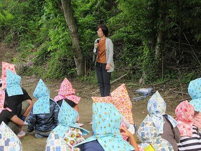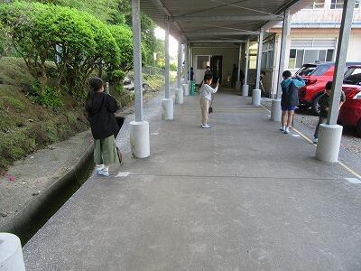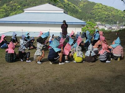 地震発生の放送の後、担任の指示に従い机の下に身を隠し、津波発生の報告の後、防災頭巾をかぶり体育館裏山の避難所に避難しました。全員の児童が速やかに無言に避難することができました。1年生は初めての避難訓練でしたがとても上手に避難できました。