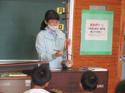 24日に、2・3年生は、日南市学校図書館司書の多田先生によるブックトークを体験しました。今回は、先日の村上三絃道さんのコンサートを受けて、日本全国の楽器についての紹介でした。和太鼓、ひちりき、三線。縦笛、横笛、鐘等の楽器の実物を見ながら、どこの国で発祥したのか、どのように演奏するのか等についての話を聴きました。初めて目にする楽器も多く、子ども達はとても興味深い様子でした。