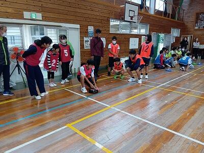 中学生をリーダーに、異学年で6グループに分かれて、勝敗を競いました。中学生が優しく教えてくれたり、他校の子ども達と触れ合ったりと、とても楽しめたようでした。