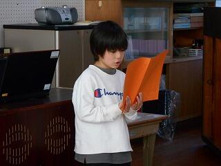 終業式では、まず代表児童の1年生が作文発表をしました。