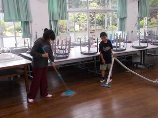 少ない人数ですが、モップや掃除機を使い、協力して学校をきれいにしています。