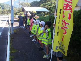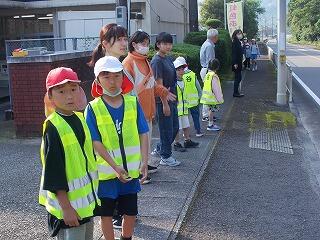 登校してきた児童が、次々に校門前に出て来て、通る車に元気な声であいさつをします。
