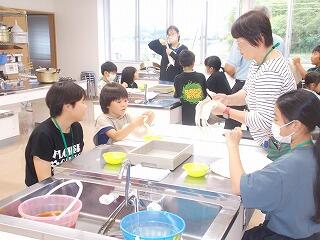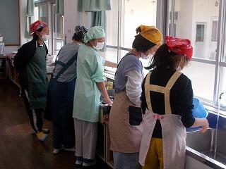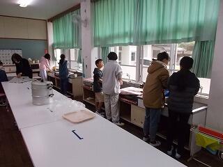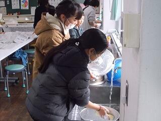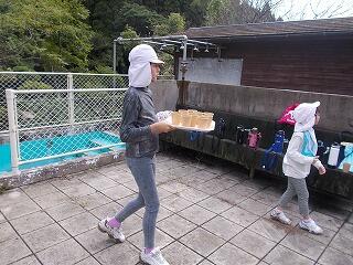 上学年が洗った道具を、下学年の児童が手際よく干していきます。