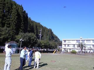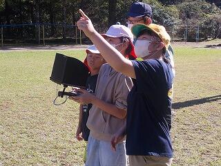 その後、運動場で3班に分かれ、重機・アーチ橋の体験、花植え、ドローンの操縦に挑戦しました。