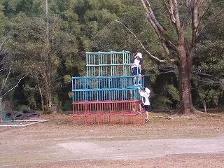 まずはサーキットトレーニングです。校庭の遊具を使って体を鍛えます。