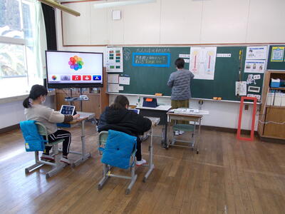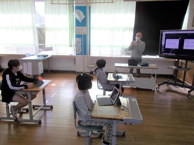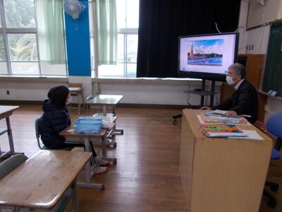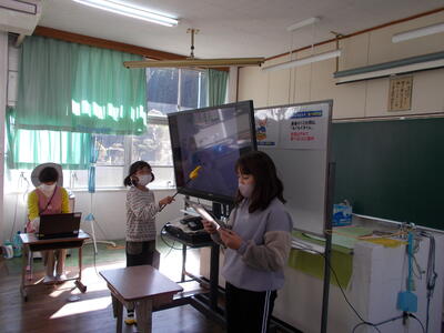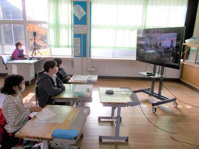 ICT支援員の方にICT機器を設置していただき、遠隔での交流授業でした。