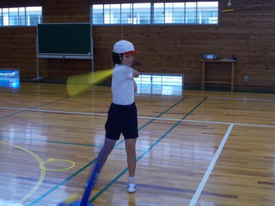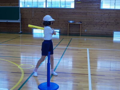 ティーの上に置かれたボールを打ちます。楽しく学習していました。