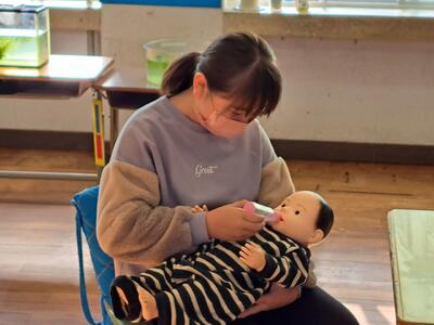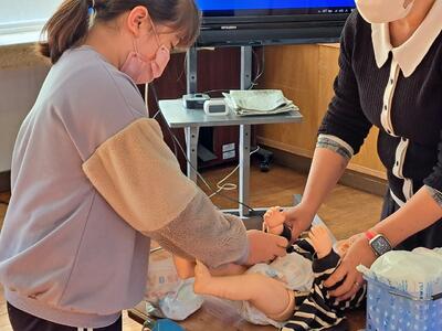 実際に赤ちゃん人形を使い、抱っこをしたり、衣服の着脱の実技体験を行いました。