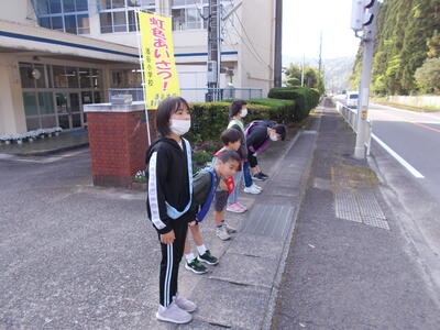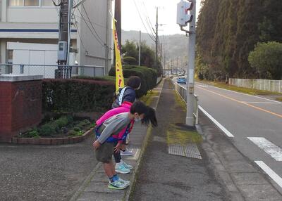 学校に登校してきた児童は、校門前に出て通る車に元気な声であいさつをします。