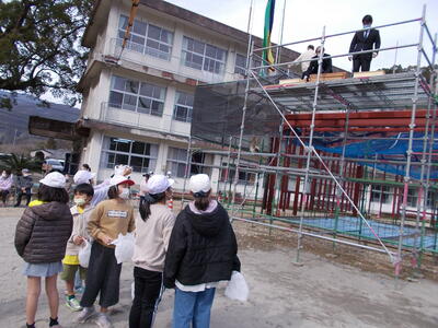 今回、お声かけをいただき、全校児童で上棟式に参加しました。