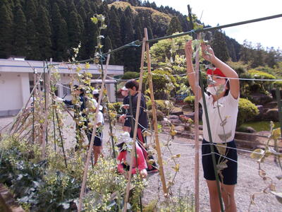 みんなでスナップエンドウを抜いた後、草取りをして、畑をきれいにしていました。