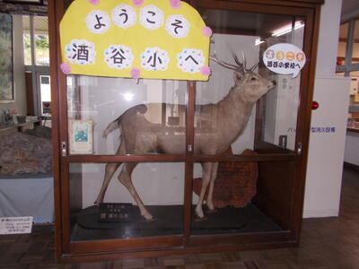 酒谷小の玄関にはエゾ鹿の剥製が展示してあります。