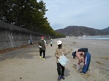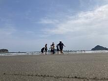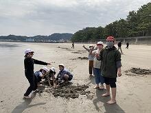 弁当の日ということで、それぞれ自分が握ったおにぎりやつくったおかずが入った弁当をおいしくいただきました。弁当の後は、浜遊び。美しい青空と海のもと、砂の造形を楽しみ、遊んだ後は全員で浜のゴミ拾いをしました。来たときよりも美しくなった浜に感動しました。
