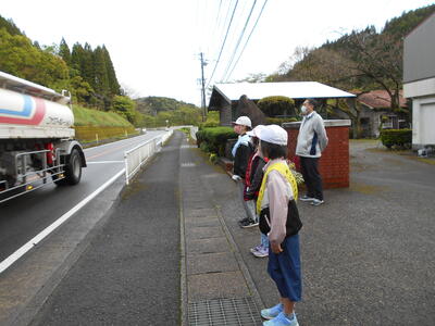 児童は校門そばに集まって、元気のよい声で「おはようございます。」と通行する車の運転手さんにあいさつをします。