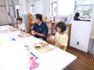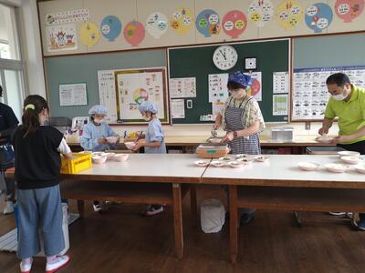 今日も先生方と子どもたちは協力して、給食の準備をしています。