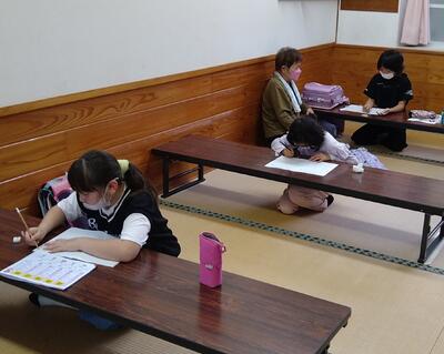 習字の基本である打ち込み、とめ、はね、はらいなどの練習をしています。