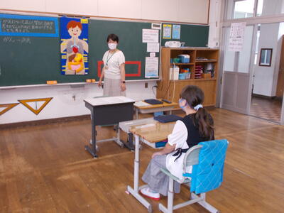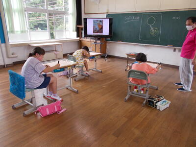 子どもたちは、養護教諭から「正しい姿勢の大切さ」についても学び、