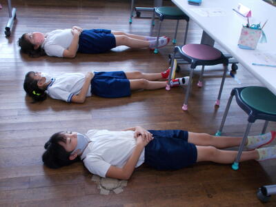 右の写真は、リラックスするための呼吸法を実践している様子です。