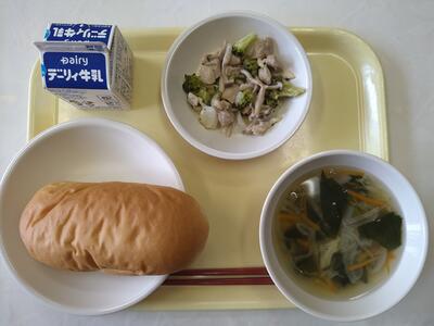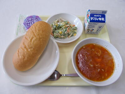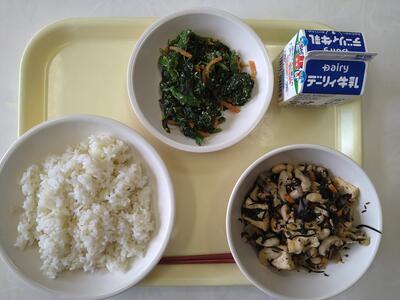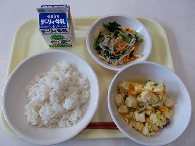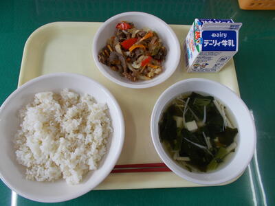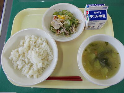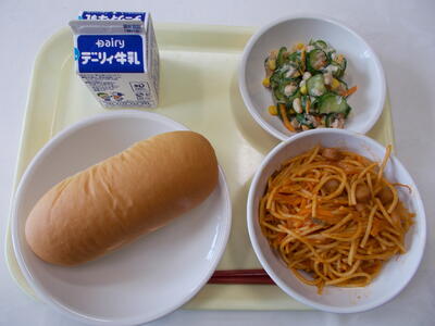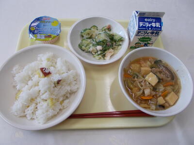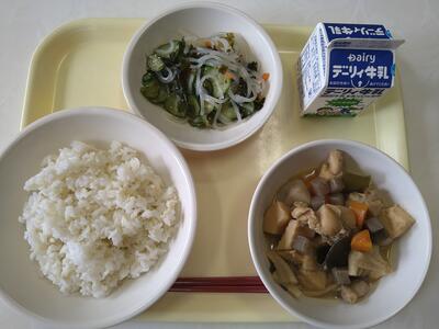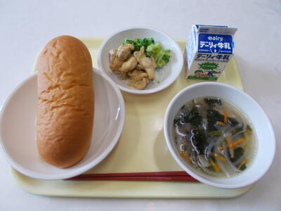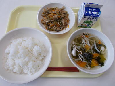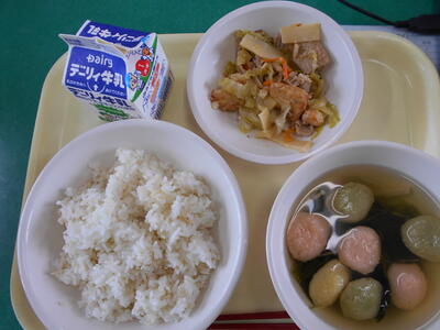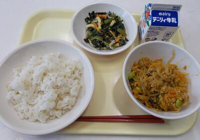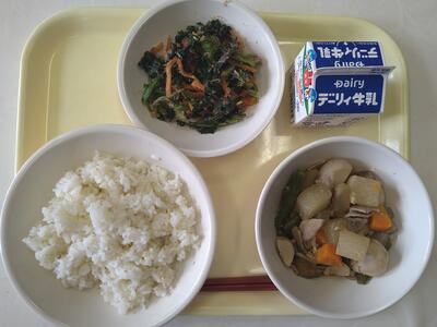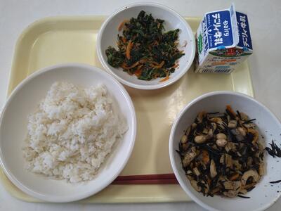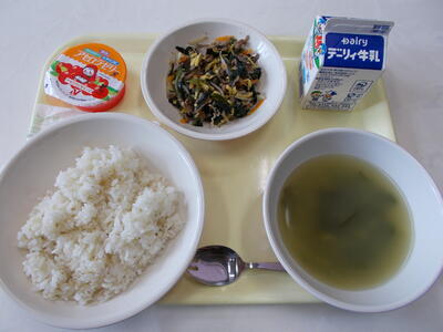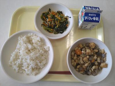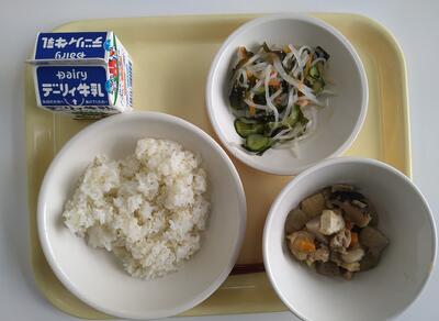 明日は中学校の卒業式です。そのお祝いの意味をこめた献立となっています。赤飯は、古くから日本で食べられているものです。赤い色には邪気を祓う力があるといわれ、お祝いの席で食べられるようになったそうです。また、赤飯には豆も入っており、タンパク質も豊富です。卒業される皆さんのこれからの活躍を願って、いただきました。