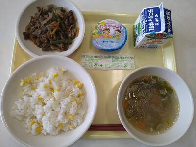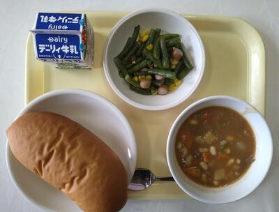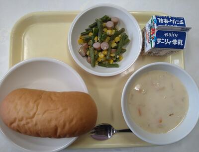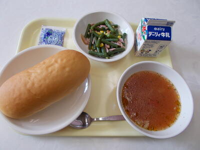 ソテーとは肉や魚、野菜などの食材を油やバターなどで炒めた料理です。今日は、いんげんとコーン、ウィンナーが入っています。今日もおいしくいただきました。ごちそうさまでした。