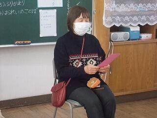 「今日はもちつきの手伝いに来てくださって、ありがとうございます。ぼくは、地域の方達ともちつきをするのは初めてですが、皆さんと協力してもちつきをして、おいしいおもちを作りたいです。分からないことは、教えてほしいです。今日はよろしくお願いします。」