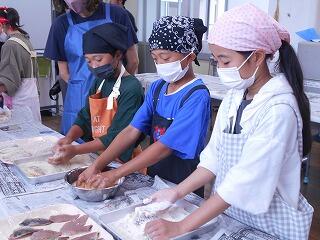 次に調理実習です。保護者の方や、南郷漁協女性部の皆さんにも、お手伝いいただきながら進めました。