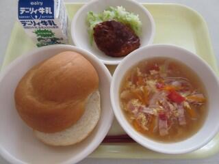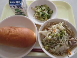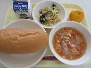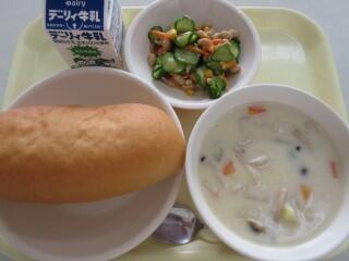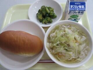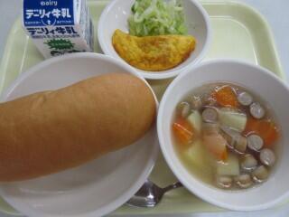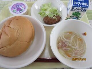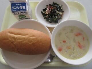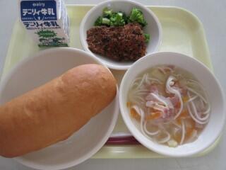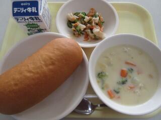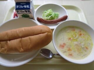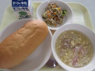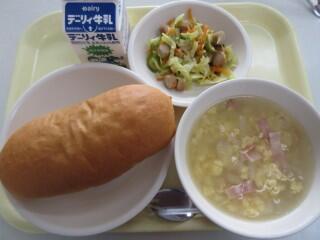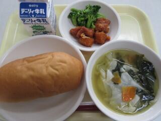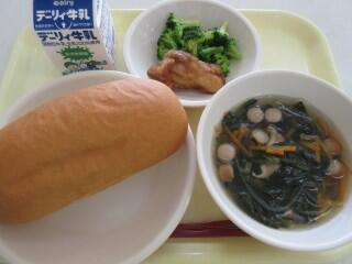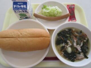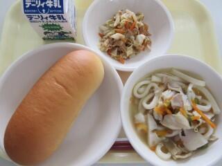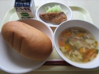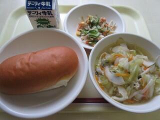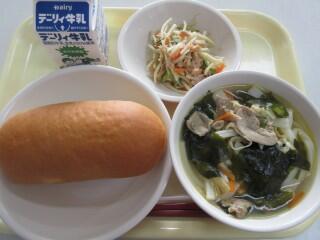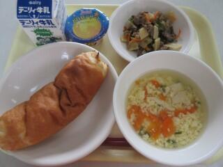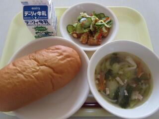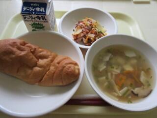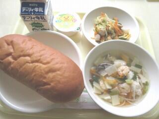 ミルクパン、ワンタンスープ、魚のサラダ、牛乳