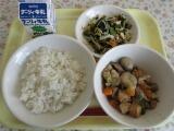 今日の小さいおかずは千草和えでした。千草は「たくさん」という意味でいろいろな種類の材料で作った和え物です。今日の給食には、ほうれん草、にんじん、もやし、いか、あげが入っていました。栄養もたっぷりで、子どもたちもおいしそうに食べていました。