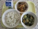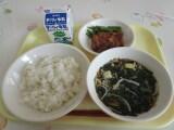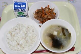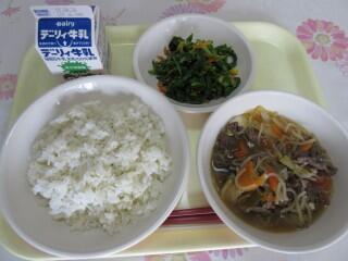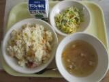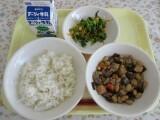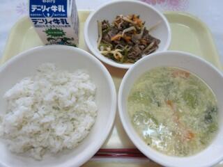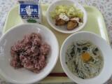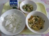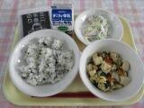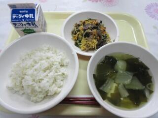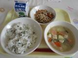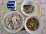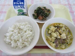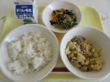 三色そぼろ丼、いかのぼったり汁、牛乳