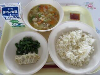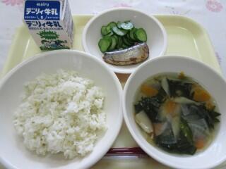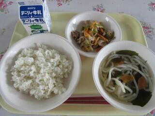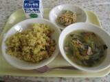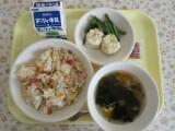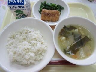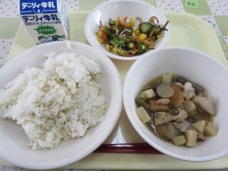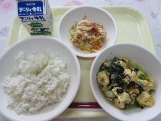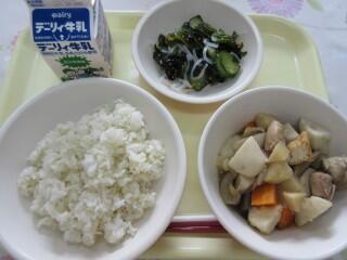 むぎごはん、鶏肉のレモン煮、ブロッコリー、かき玉汁、フレッシュパイン、牛乳