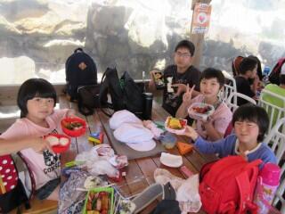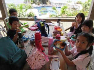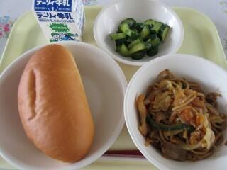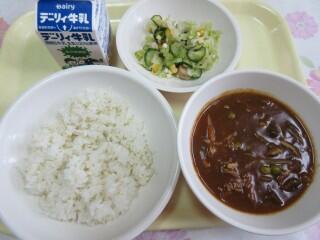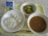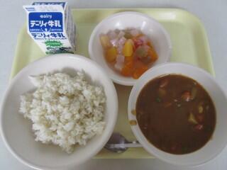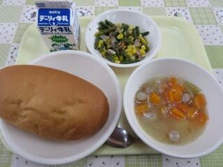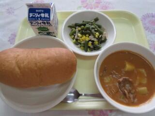 ポークビーンズは、文字通り豚肉と豆などをトマト味で煮込んだものです。アメリカの代表的な家庭料理の1つで、給食でも定番のメニューです。ポークビーンズをコッペパンに付けながら食べている子もいました。