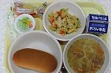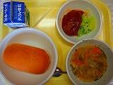 ポークビーズ、ほうれんそうとベーコンのソテー、コッペパン、牛乳
