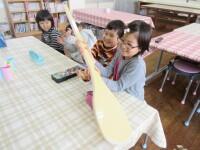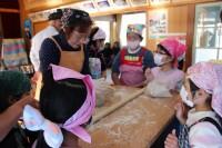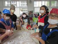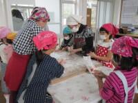 子どもたちは、地域の方々に教えていただきながらそば粉をこね、平たくのばし、専用の大きな包丁で切る、というとても貴重な体験をさせていただきました。地域の方々が「こうやってするんだよ~」「上手だね~」と優しく声をかけてくださりながら、子どもたちはとても楽しそうに取り組んでいました。