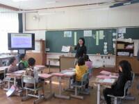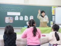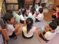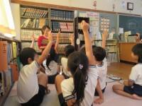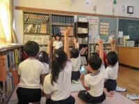 2校時には1・2年生の国語の時間に、図書司書の藤島先生がアニマシオンという手法で読み聞かせをしてくださいました。アニマシオンとは、子どもの読みの能力の発達段階に沿って、遊びの要素を取り入れたスタイルで、楽しく読書体験を積みながら、深く読む習慣、読解力、コミュニケーション能力を養うことを目指すものです。今日はその中でも2つの手法でしていただきました。