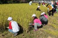 10月16日、晴れ渡った秋空の下、稲刈りを行いました。本校では毎年全校で行っているので高学年は手慣れたものです。素早く稲を刈り、ひもで束ねる様子に頼もしさを感じました。