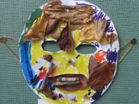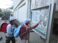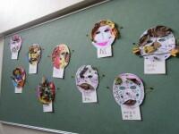階段の掲示板には1・2年生が生活の授業で作成したお面が掲示してあります。階段をのぼって初めて見たとき、インパクトが大きくてビックリします。運動場で落ち葉や枝、どんぐりなど秋を見つけ、お面に貼った作品です。お面の台紙はみんな同じ形ですが、個性の光る思い思いの作品ができあがっています。