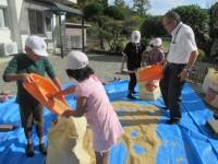 11月21日(土)、もちつき大会がありました。1~6年生全員が餅つきと餅丸めを経験します。餅つきでは保護者や地域の方と一緒につくタイミングを合わせながら楽しく餅つきをしていました。親子餅つきではたくさんの笑顔が見られました。持丸めでは地域の方にコツを教えてもらいながら小さな手でお餅を大切そうに丸めていました。その後は芝生の上で実食です。自分たちで田植えから稲刈りをし、餅つきをしたしょうゆ味ときなこ味の餅は絶品のおいしさだったようです。朝早くからお手伝いに来てくださった保護者、地域の皆様ありがとうございました。