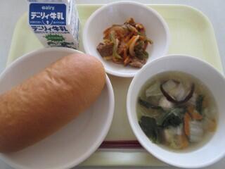 ミルクパン、ワンタンスープ、魚のサラダ、牛乳