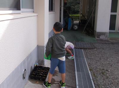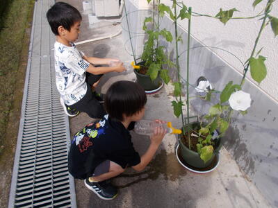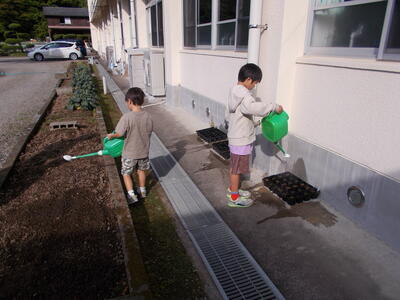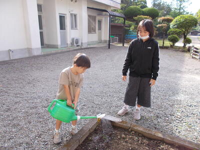 今日の朝は、3,4年の児童と1年生の児童が、ポットや花壇の水やりをしていました。