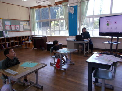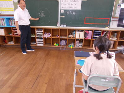 算数は複式指導を行っており、2つの学年を一人の教師が交互に渡りながら授業を進めます。