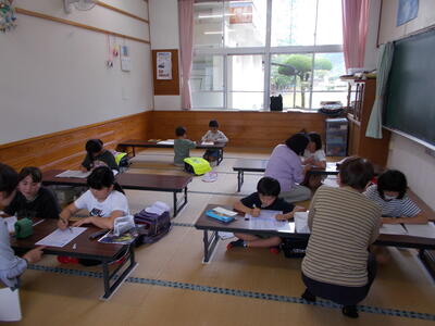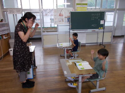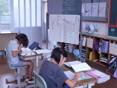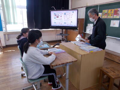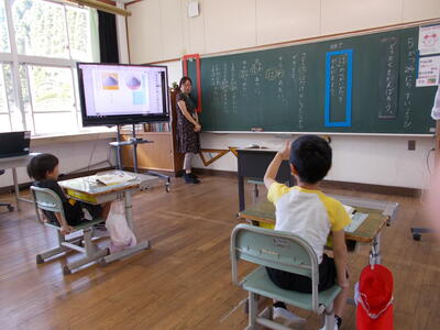 国語は複式指導を行っており、2つの学年を一人の教師が交互に渡りながら授業を進めます。
