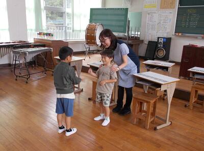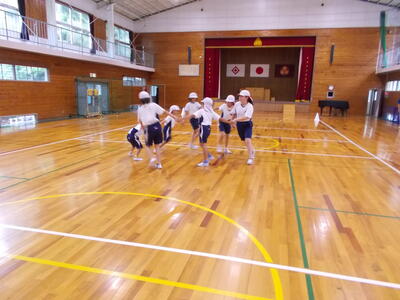 音楽室をのぞいてみると、1年生はじゃんけん列車をしていました。