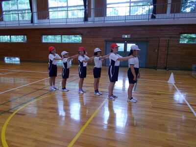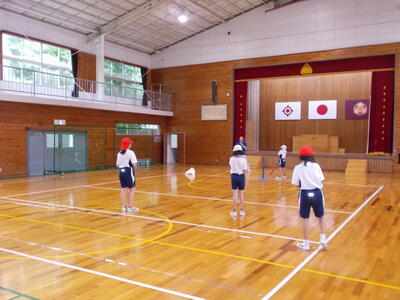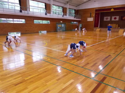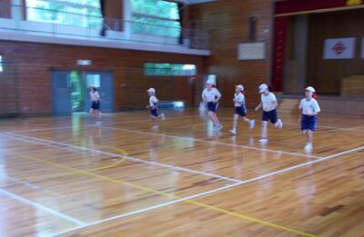 体育館で汗びっしょりになって、体育を頑張っていました。