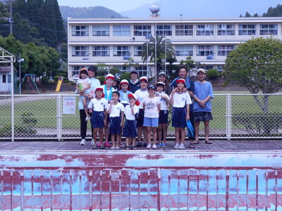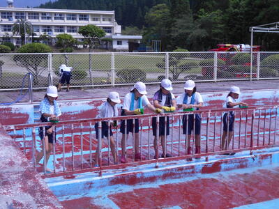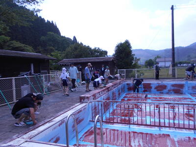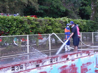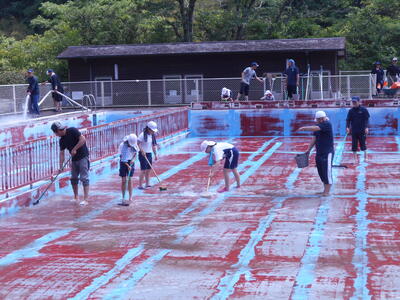 5月21日(日)に、プール掃除を行いました。当日は、消防団の方々にもご協力をいただきました。天候にも恵まれ、短時間で清掃を終えることができました。
