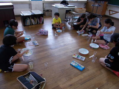 3,4年生は図工で長いヘビの絵を工夫して描いていました。